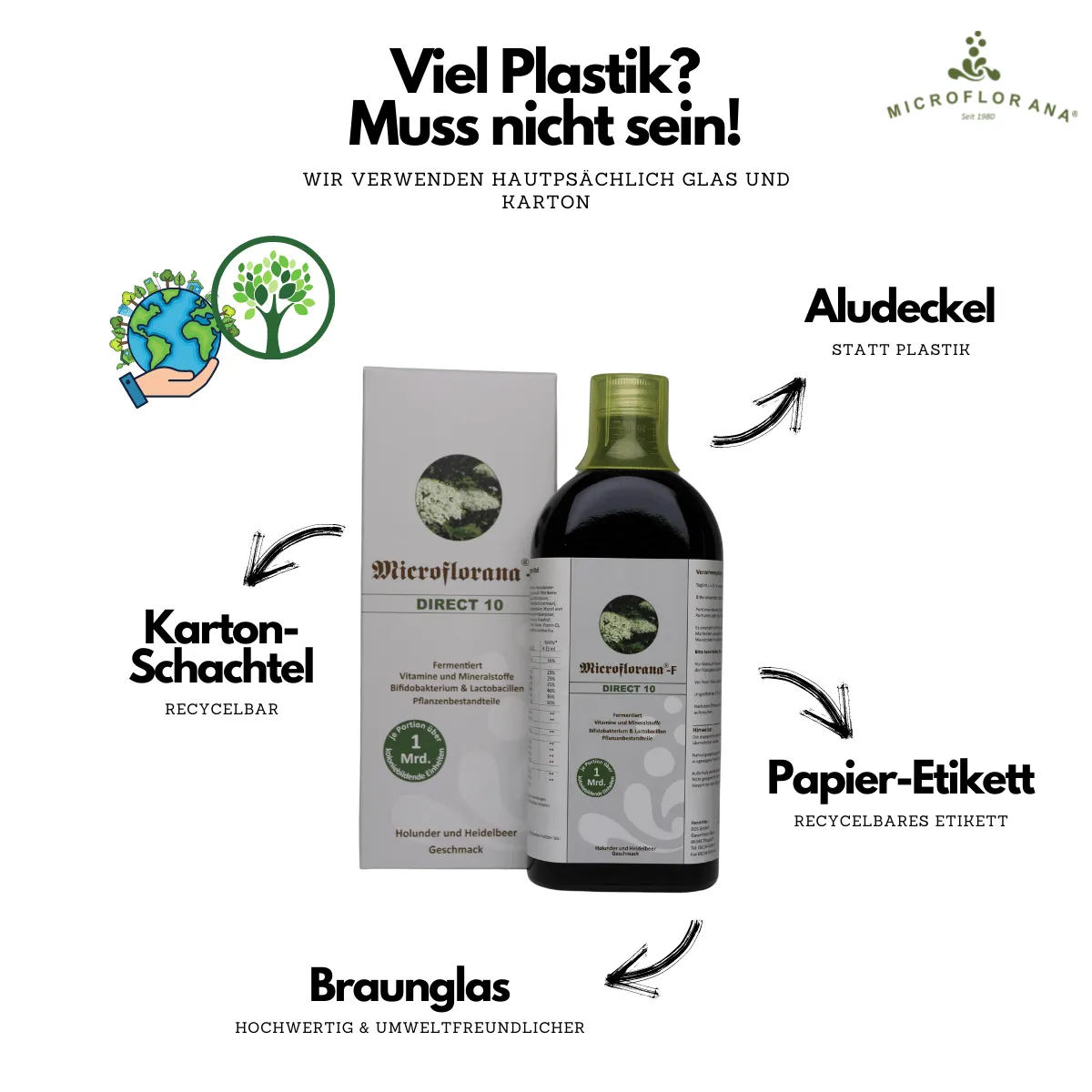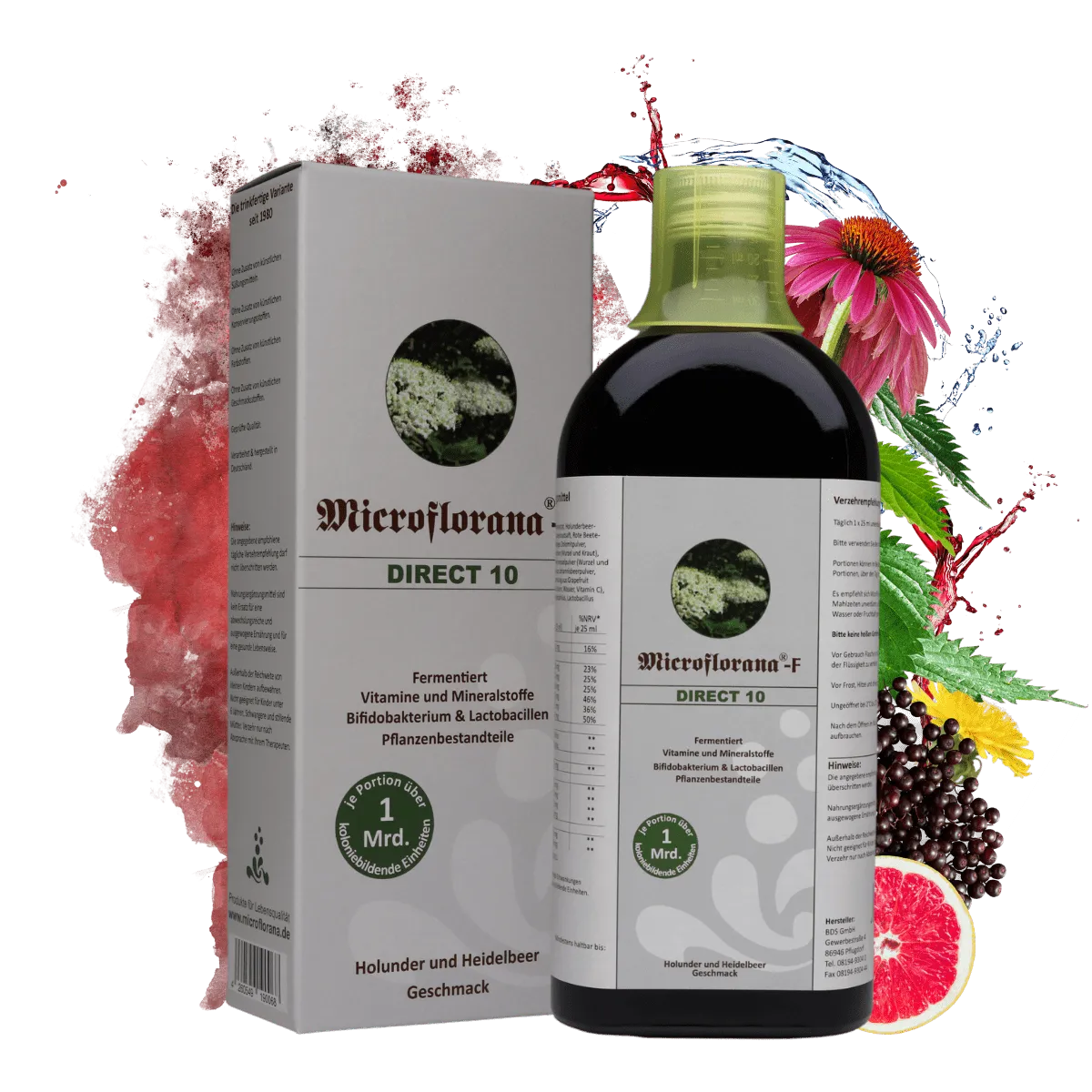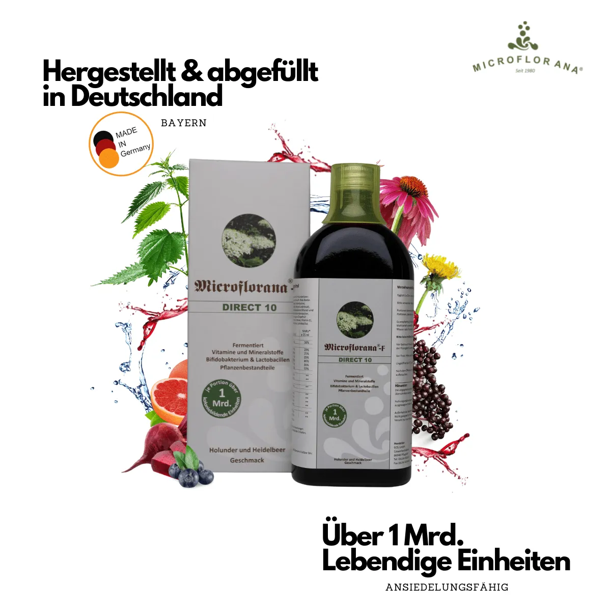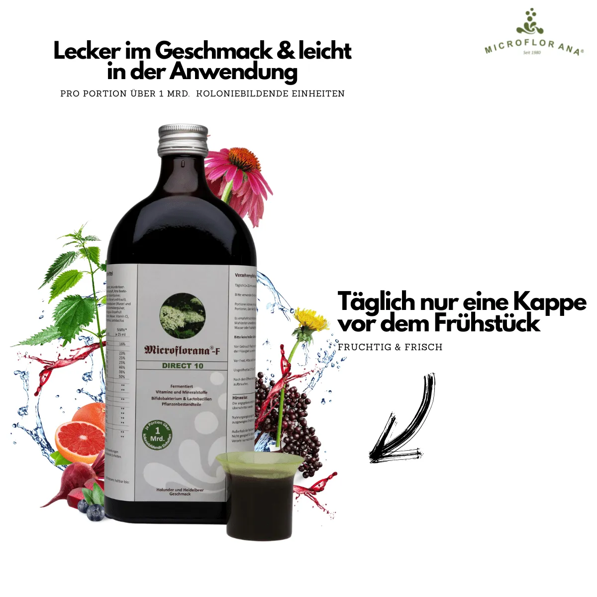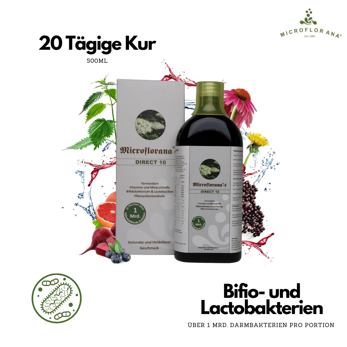 Im Gegensatz zu Microflorana®-F „Das Original“ ist das Microflorana®-F Direct 10 eine optimale Zusammenstellung von 40 % Microflorana®-F ergänzt mit Holunder- und Heidelbeerkonzentrat. Nach einer Darmsanierungskur mit unserem Optimalen Paar bestehend aus Microflorana®-F und Micro Basic® ist Microflorana®-F Direct 10 die ideale Ergänzung, um die Darmflora im Gleichgewicht zu halten. Dieses Produkt wird aufgrund des hohen Anteils von Saftkonzentraten besonders gern von Kindern über 6 Monaten getrunken.
